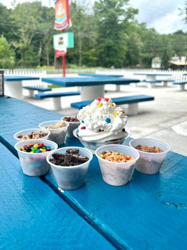 Heath, M&M's, Butterfinger, Oreo, and Riece Pieces (PB cups & cookie dough are extra charge)